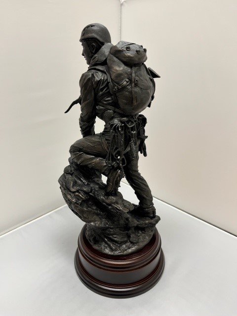 This is the cold cast bronze 12" Scale Alpine Mountaineering sculpture. Fully equipped for a tough ascent he is climbing a rock face wearing helmet, harness, crampons and carrying an ice axe. This statue makes a great gift for anyone who loves to climb summits, or as a reminder of a particular challenging climb.